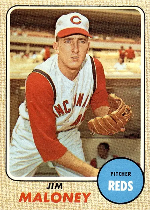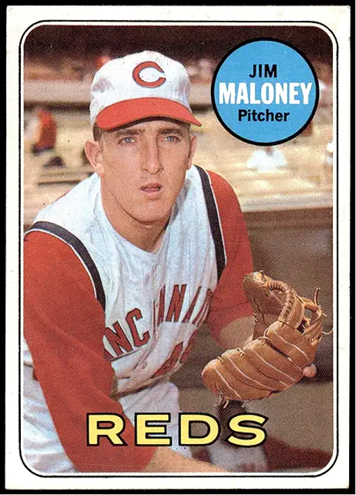 Reds’ pitcher Jim Maloney’s 1969 card, at first glance, seems like an obvious repeat of 1968. But look closer. Small details in the background indicate the photos were actually taken a few seconds apart. We know this because a fan in the stands in a red jacket behind Maloney has moved slightly between clicks of the camera.