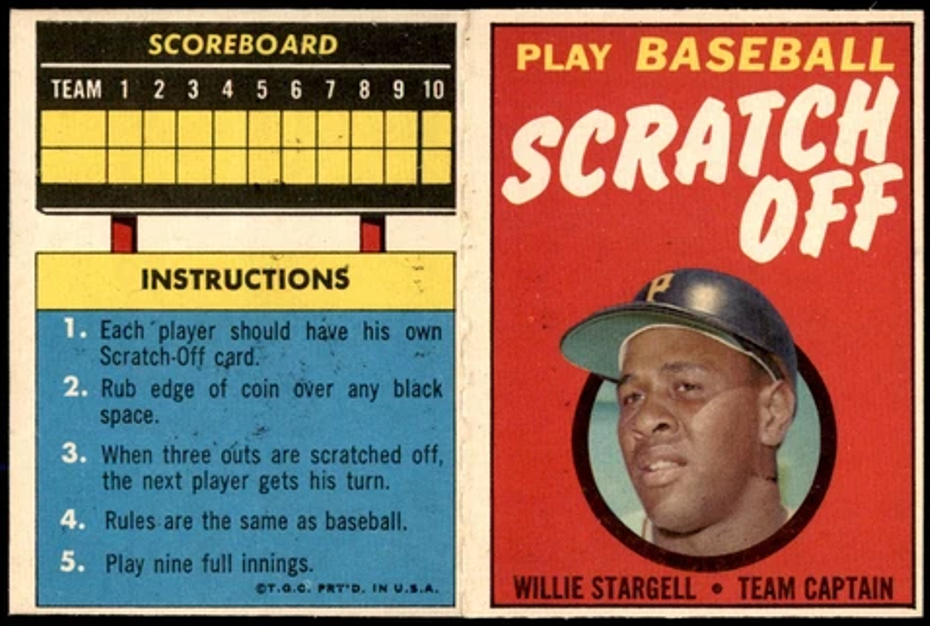 Scratch-Offs (folded pack inserts) had 44 black rectangles on backs – revealing a play when scratched.