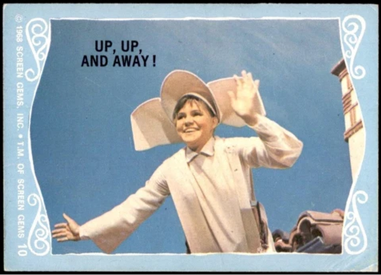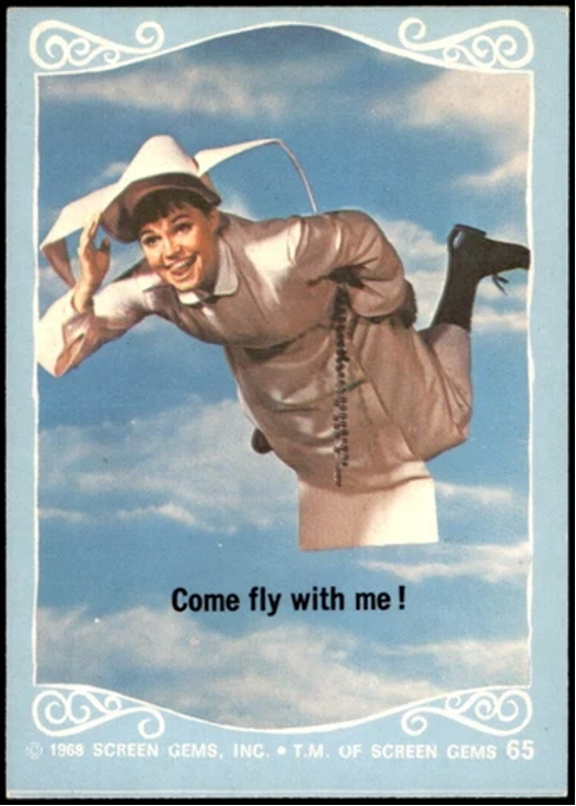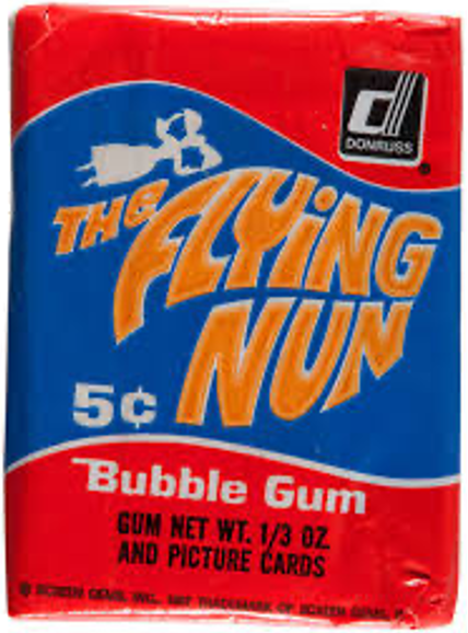 In 1968, Donruss stepped up the plate – so to speak – and issued a 66-card set focused on “The Flying Nun” TV series. Card fronts (as shown) were a hit as they featured scenes from the show. Card backs, unfortunately, were a miss as they were just pieces of a giant puzzle. The puzzle backs were fairly common during this era of non-sports cards. Yet, they always seemed kind of cheap, as no details about the actual show is included.